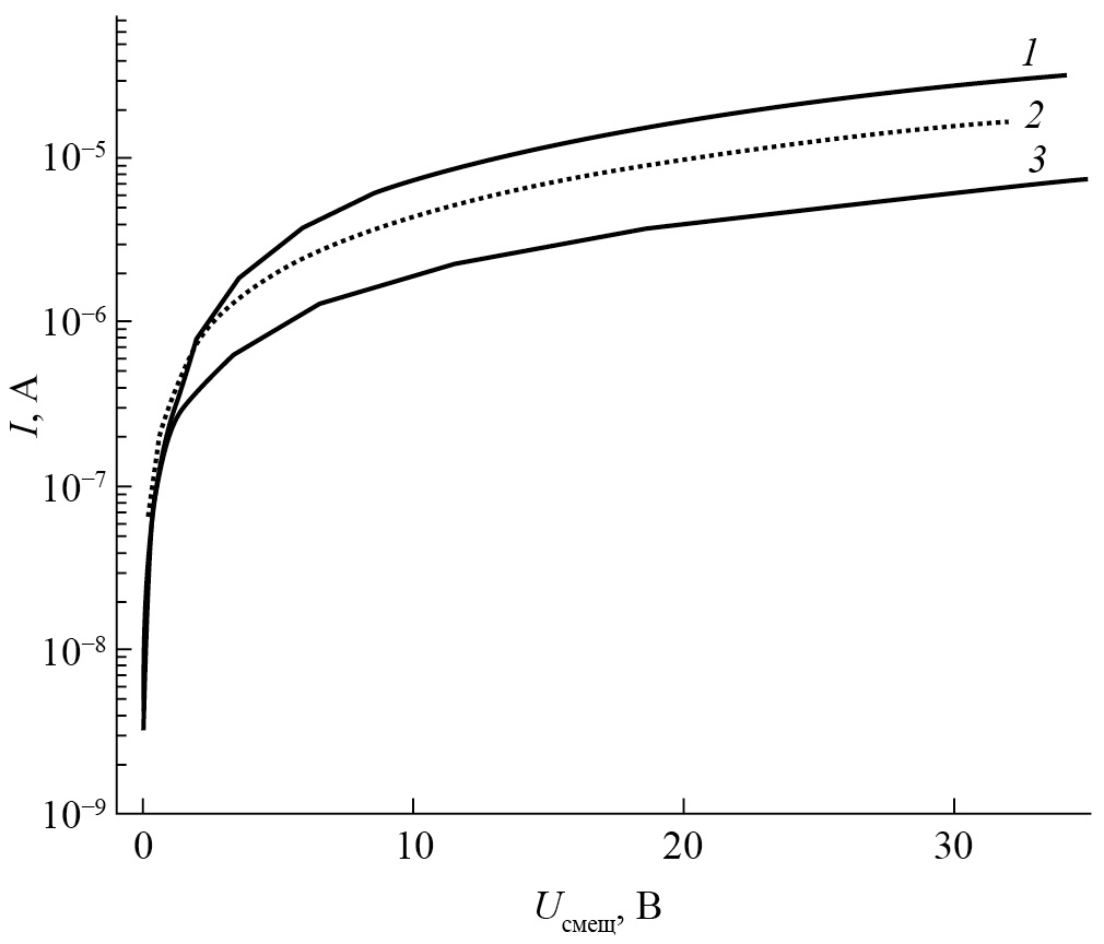 Измерение вольт-амперных характеристик изготовленных МПМ-диодов показало, что их темновые токи при напряжении смещения 5 В составляют несколько микроампер и возрастают на порядок величины при увеличении смещения до 35 В (рис. 7). Диодные структуры без пробоя выдерживают увеличение напряжения смещения вплоть до 50 В.