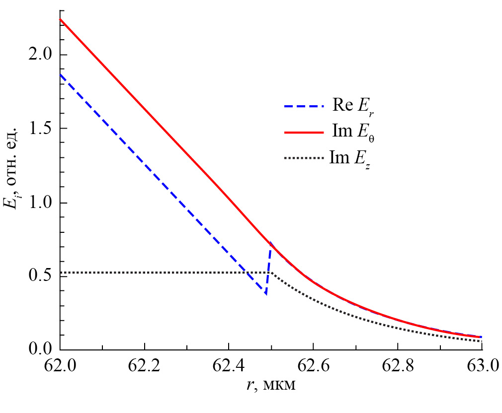 Из рис. 2а видно, что внутри основной части оболочки продольная составляющая электрического поля Ez меньше радиальной Er и азимутальной Eθ составляющих поля на два-три порядка, что хорошо известно [45]. Однако вблизи границы оболочки волокна с внешней средой, на расстояниях порядка длины волны от границы внутрь волокна, и во внешней среде вплоть до бесконечности продольная составляющая Ez соизмерима с поперечными составляющими поля (рис. 2б).