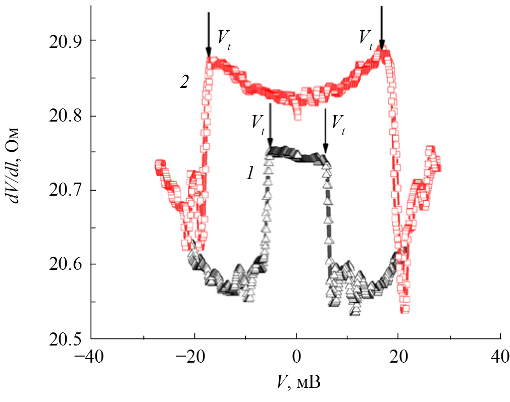 Рис. 4. Дифференциальные вольт-амперные характеристики мостика с характерным порогом (на рисунке обозначены пороговые напряжения Vt), вследствие срыва и скольжения ВЗП, соответственно до (1) и после временной выдержки 138 ч (2). Кривые сдвинуты друг относительно друга по оси y.