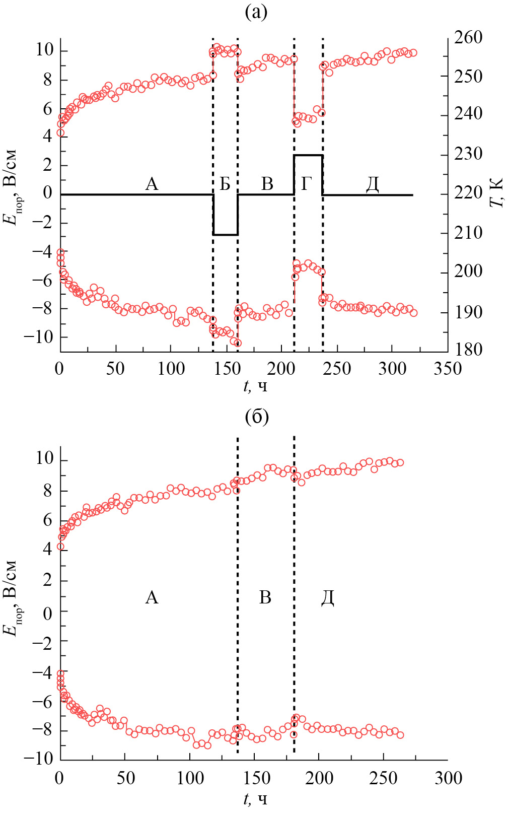 Б. Затем температура была уменьшена до Tвыд2 = 210 К и выдерживалась на протяжении t2 = 22 ч. При понижении температуры был зафиксирован рост порогового поля в начальный момент. Связано это с тем, что при понижении температуры пороговое поле образца линейно увеличивается, соответственно, и произошел скачок в значении.