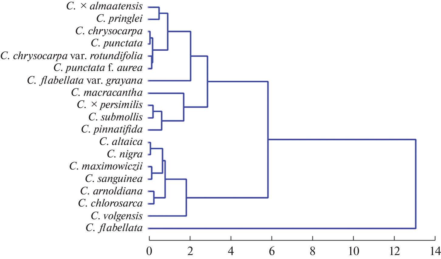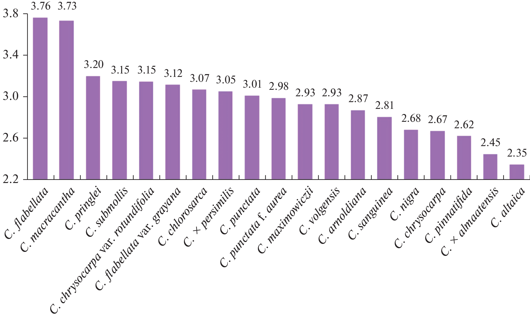 —The study assessed the content of ash elements in the dry matter of fruits, flowers and leaves of 19 hawthorn (Crataegus L.) species. The plants from the collection of the Botanical Garden-Institute of the Volga State University of Technology (VSUT), the Mari El Republic, were studied. The content of eight elements was determined by atomic absorption spectrometry. It is shown that ash and trace elements content is species-specific. The ash content in dry fruits is highest in C. flabellate (Bosc) K. Koch and C. macracantha Lodd., and lowest in C. × almaatensis Pojark. and C. altaica (Loud.) Lange. The highest content of Fe was found in C. pinnatifida Bunge, Mn – in C. flabellate (Bosc) K. Koch, Zn – in C. volgensis Pojark., C. maximowiczii C.K. Schneid. and C. nigra Waldst. et Kit., Cu – in C. volgensis Pojark., Ni, Sr and Co – in C. macracantha Lodd., Cd – in C. altaica (Loud.) Lange, C. macracantha Lodd., C. volgensis Pojark. Difference in the fruit elemental composition between hawthorn species may be due to the difference in proportion of pulp and seeds. The content of ash and mineral elements in hawthorn fruits varies depending on the growing season conditions. The content of Fe, Zn and Ni increases in years with warm and humid summers, while the content of Mn decreases, but the weather conditions of the growing season account for only 3.8 to 28.8% of the variance of values. In hawthorn, the concentration of trace elements essential for humans, especially Zn, is significantly higher in flowers, than in fruits, and, on the contrary, concentration of potentially toxic Sr is higher in fruits. In leaves, especially harvested in autumn, Sr content is tens of times higher than in fruits.