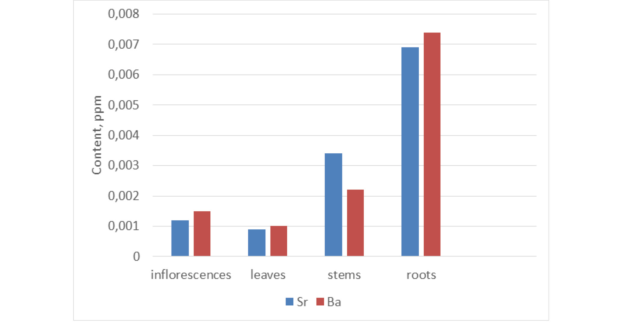 Различия в накоплении ТМ в разных органах водных растений представляют интерес для выявления путей их поглощения и передвижения. С этой целью определяли содержание Sr и Ba в различных органах Polygonum amphibium (рис. 2). Минимальными значениями содержания обоих металлов характеризуются листья, а максимальные их концентрации зарегистрированы в корнях. Интересно отметить, что в листьях содержание Sr больше по сравнению с Ba, а в корнях наблюдается обратное соотношение этих металлов. Анализ полученных данных показывает, что оба металла поступают в растение из грунта, задерживаются в корнях и слабо передвигаются в надземные части рдеста гребенчатого.