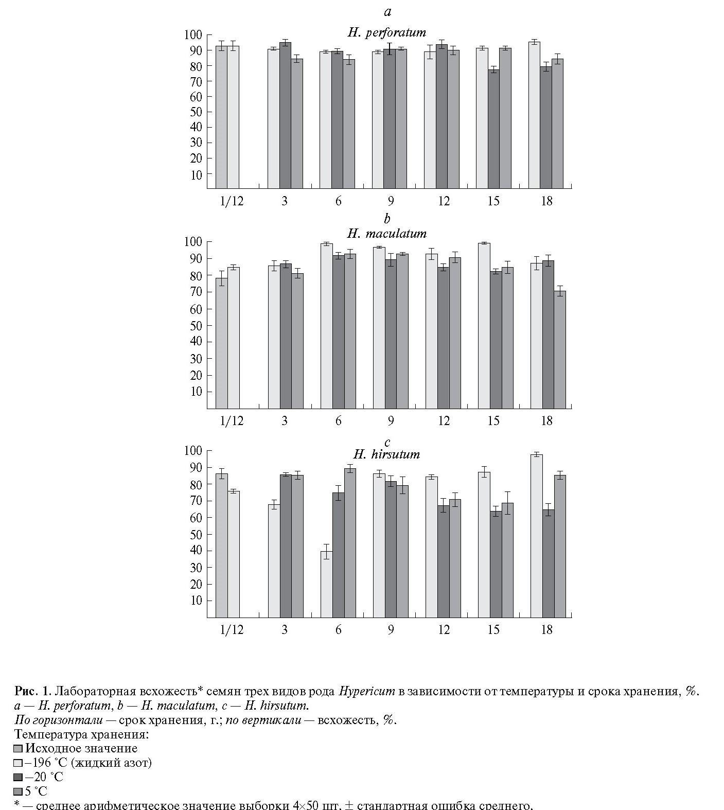 Комплексный анализ результатов изучения всхожести, динамики прорастания и развития проростков семян трех видов рода Hypericum L. (Hypericaceae): H. perforatum L., H. maculatum Crantz. и H. hirsutum L., хранившихся 18 лет при температуре –196 (в жидком азоте), —20 ± 2 и 5 ± 1 °С показал следующее.