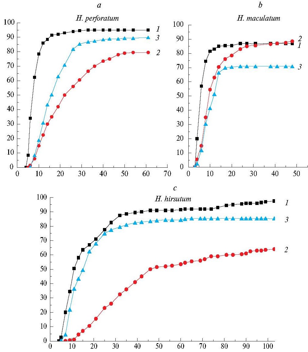 Рис. 2. Динамика прорастания семян трех видов рода Hypericum после 18 лет хранения при различной температуре.
