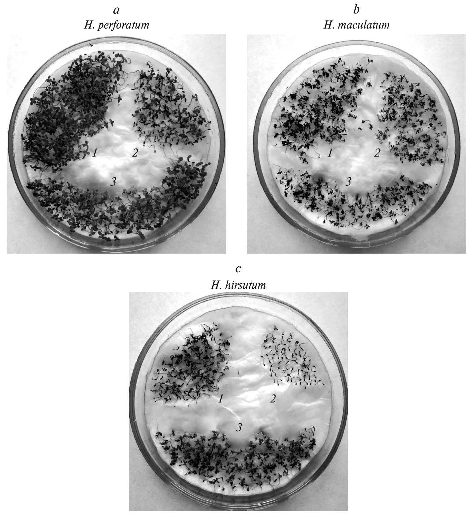 - С целью мониторинга качества семена perforatum и H. maculatum после извлечения из ЖА до их увлажнения водой для проращивания следует экспонировать на воздухе в комнатных условиях не менее 1 суток для того, чтобы регидратация мембран проходила при низком градиенте влажности. В течение такого же срока рекомендуется экспонировать в комнатных условиях семена, хранившиеся при отрицательных и низких положительных температурах, для стабилизации внутриклеточных компонентов в теплых условиях. Семена H. hirsutum, как более чувствительные к условиям регидратации, следует экспонировать не менее 2 суток.