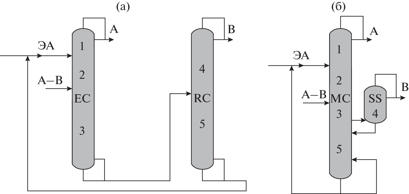 The extractive distillation of three binary mixtures (acetone–chloroform, acetone–methanol, and allyl alcohol–allyl acetate) in traditional two-column schemes and in sequence with partially coupled heat and material flows is considered. The optimal scheme parameters according to the criterion of total energy costs in column boilers are determined. It is shown that the use of sequence with partially coupled heat and material flows provides energy cost savings of 4.4–29.2% compared to the traditional scheme. It is found that during the extractive distillation of the allyl alcohol–allyl acetate mixture, the optimal values of the extractive agent flowrate for the two-column scheme and the scheme with partially coupled heat and material flows coincide; the optimal flowrate of the extractive agent in the scheme with partially coupled heat and material flows in the separation of an acetone–chloroform mixture is 1.28 times lower, and in the separation of an acetone–methanol mixture, it is 1.27 times higher than in the two-column scheme. The reasons for these differences are established.