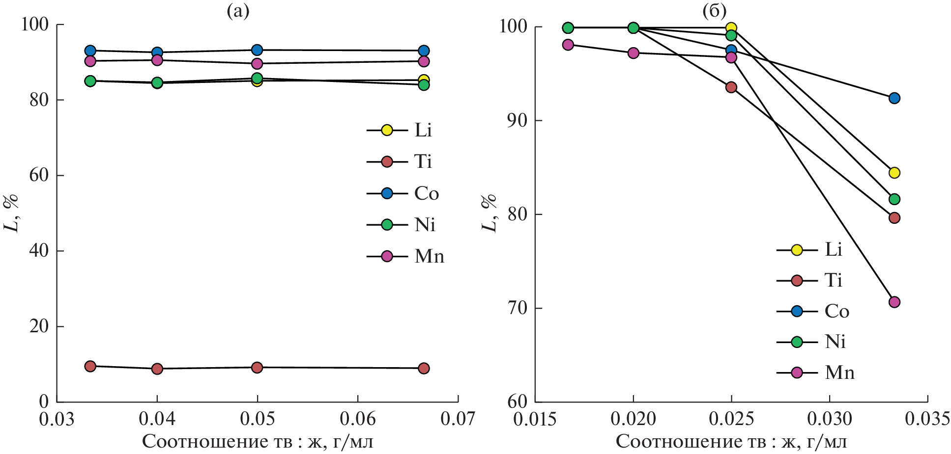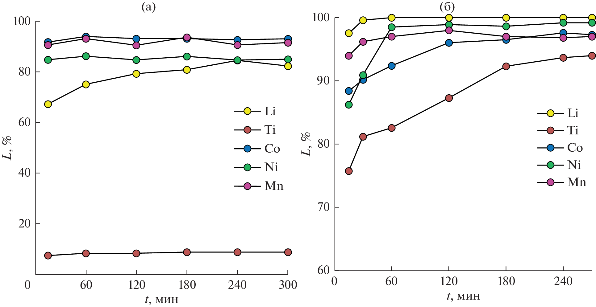 Lithium–titanate anodes are increasingly being used in the manufacturing of lithium-ion batteries due to their advantages in charge/discharge speed and safety of use relative to graphite anodes. The addition of titanium to the battery composition, along with the high content of cobalt and lithium, results in a further growth of their cost, and the reprocessing of such batteries becomes an extremely topical problem. In the framework of the present article, a comparative analysis of the hydrometallurgical reprocessing of batteries containing a lithium-titanate anode and a nickel–manganese–cobalt cathode by leaching with mineral acids (sulfuric and hydrochloric acids) is performed. In the work, the dependences of the leaching degree of the metals from real samples of the anode and cathode in their mixture on the mineral acid concentration, auxiliary additives, and solid : liquid ratio are demonstrated and the temperature and kinetic dependences for this process are obtained. Based on the results of qualitative and quantitative analysis of the leaching solutions, conditions for processing of the leaching process are proposed for further extractive separation. It is demonstrated that two-step successive leaching with hydrochloric and then sulfuric acid with the release of titanium concentrate is optimal. An important aspect of the work is the study of the joint leaching of the cathode and anode, since in the known processes of mechanical processing the stage of their separation is absent.