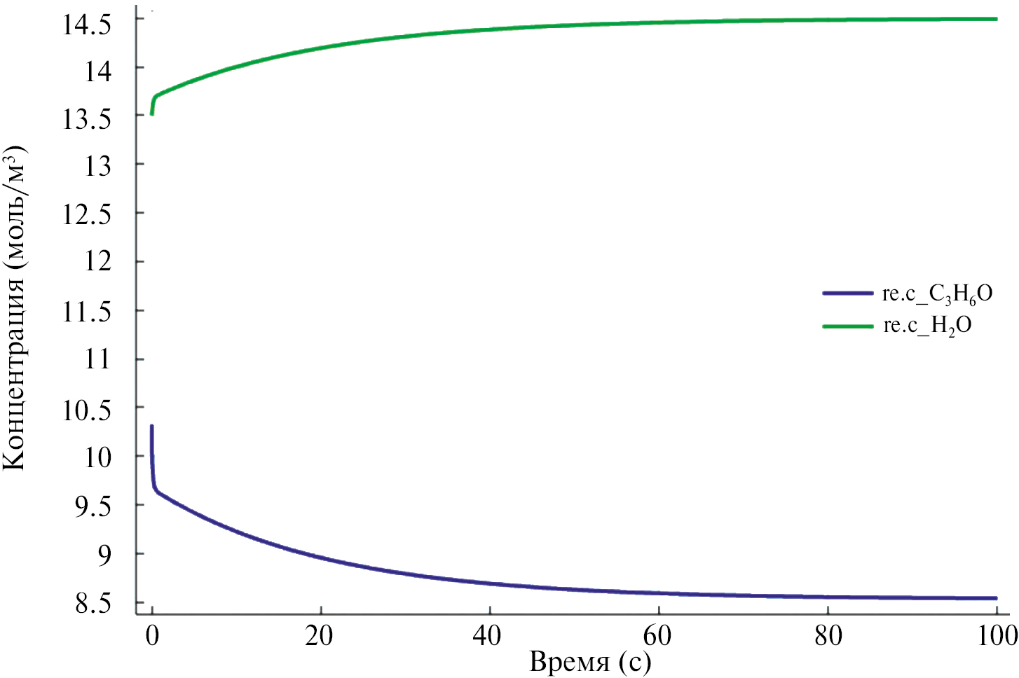 В процессе анализа рассчитываемой модели, ввиду наличия химической реакции, использовали нестанционарный режим. Наиболее оптимальное время для расчета: 30–60 секунд, поскольку концентрация изофорона остается неизменной после данного времени, что говорит об установившемся процессе.