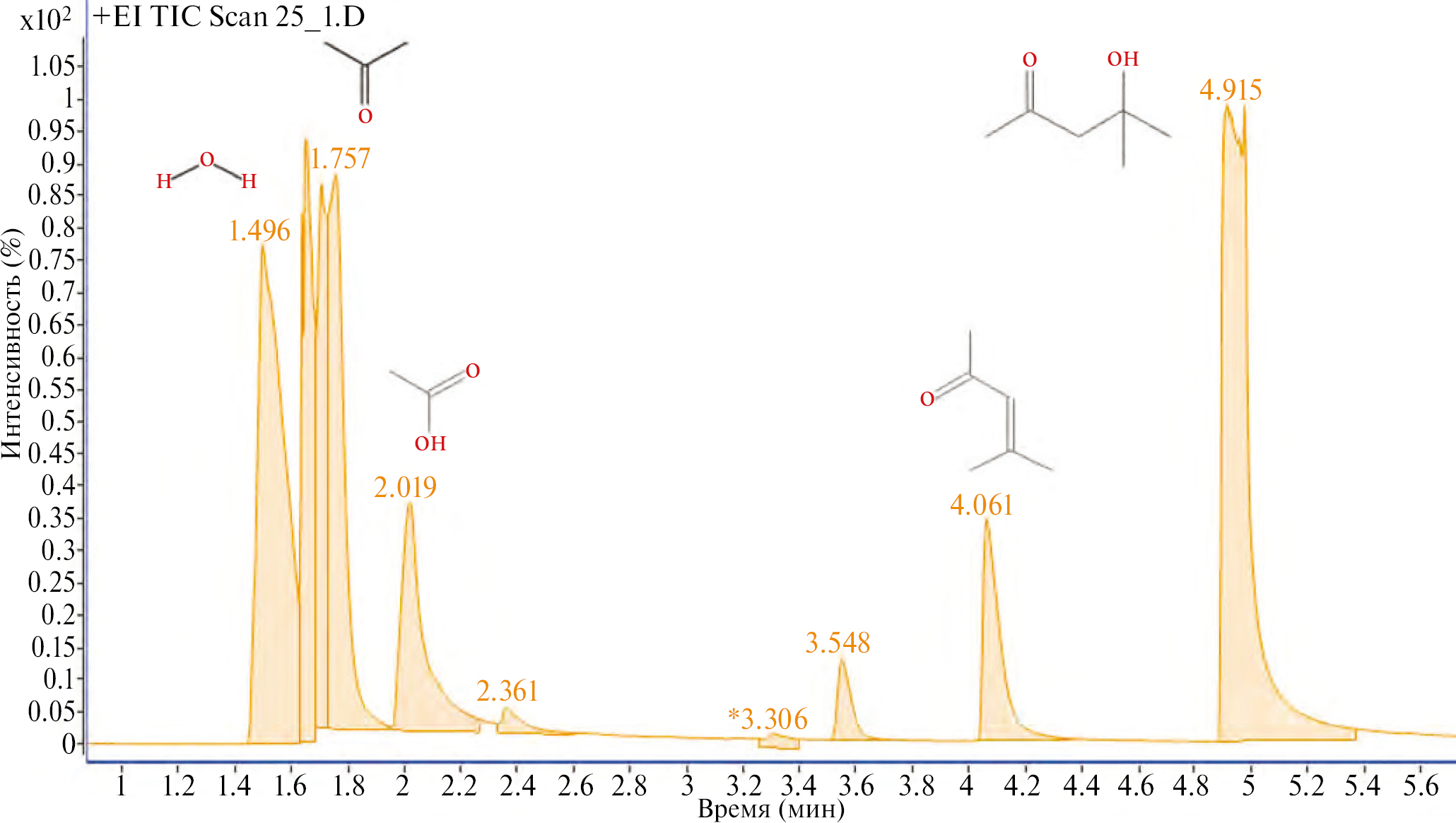 Для валидации аналитических исследований (рис. 10–11) был использован хроматограф с масс-спектрометрическим детектором Agilent 5977B GC/MSD (HES) и программным обеспечением MassHunter с масс-спектрометрической библиотекой данных органических веществ NIST17 с кварцевой капиллярной колонкой Agilent HP-5MS (30м-0,25ID-0,25um). Добавлено небольшое количество уксусной кислоты для нейтрализации щелочи. Были определены все побочные и промежуточные продукты, а также изомеры изофорона.