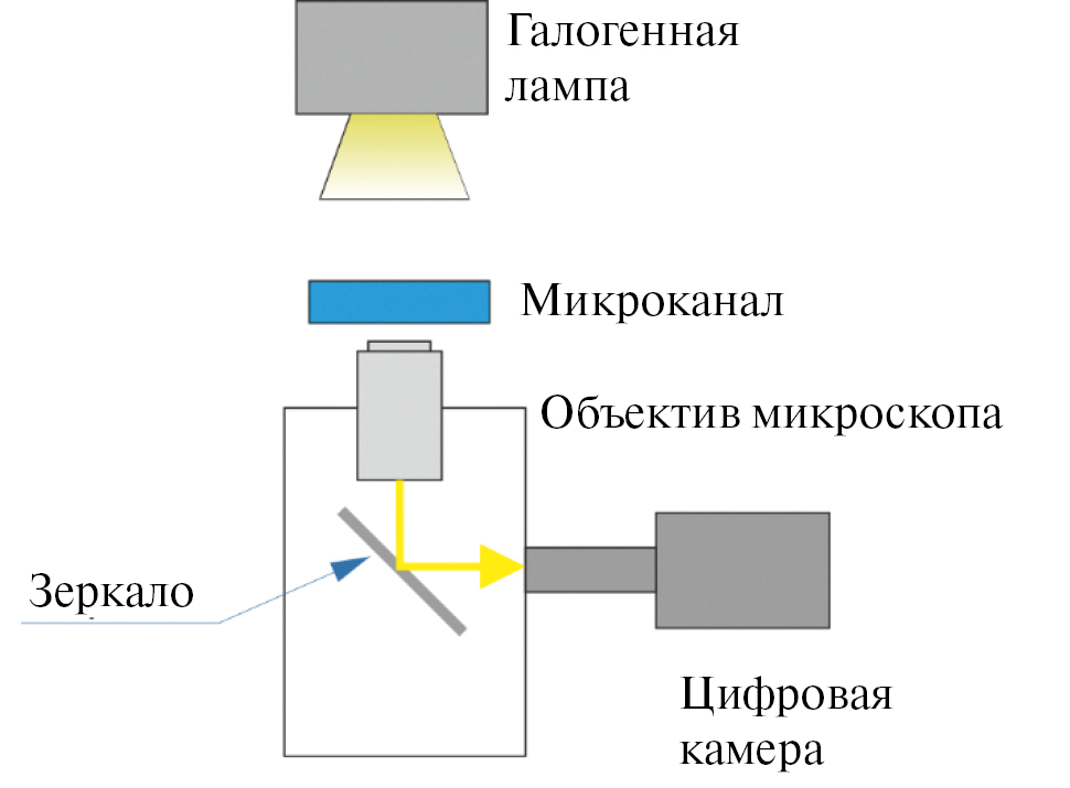 Визуализация режимов двухфазных течений. В зависимости от скоростей потока, физических свойств жидкостей, свойств материала микроканала и его геометрии реализуются различные режимы течения. Для проведения скоростной визуализации режимов течения к микроскопу подключается скоростная камера pco.1200 hs (Германия) с разрешением матрицы 1 Мпикс (1280 × 1024 пикс.), размер пикселя 12 × 12 мкм2 и частотой съемки до 1 кГц. Поток освещается галогенной лампой в проходящем свете (рис. 2), визуализация режимов течения проводится за счет разницы в показателях преломления фаз. Регистрация режимов течения проводится при вариации расходов несущей и дисперсной фаз с последующей их классификацией вручную либо с помощью нейронных сетей [14].