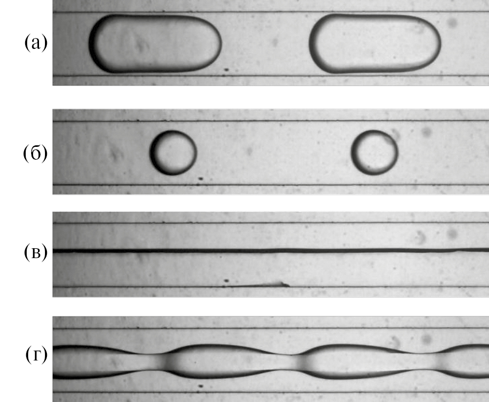 Анализ размерностей для построения универсальной карты режимов течения. Режим течения обусловлен силами, преобладающими в системе при заданных значениях управляющих параметров. Основными режимами течения в микроканалах являются снарядный, капельный, параллельный и кольцевой (рис. 3). Для построения карт необходимо классифицировать режимы течения и обозначить области их существования либо границы перехода. Типичными параметрами построения карт режимов течения являются приведенные скорости несущей и дисперсной фаз. Однако карты режимов, построенные по приведенным скоростям фаз, подходят только для заданной системы жидкостей и геометрии каналов, используемых в конкретном эксперименте.