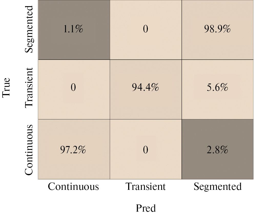 На основе экспериментальных данных по визуализации режимов течения и данных из литературы была составлена база данных о режимах течения несмешивающихся жидкостей в Т-образных микроканалах, содержащая около 6000 записей. Все режимы течения были разделены на три класса: сегментированные, непрерывные и переходные. Для увеличения данных был применен алгоритм SMOTE [21]. Полносвязная нейронная сеть была обучена на 60% данных, а остальные 40% использовались для валидации и тестирования в равных пропорциях. Входными признаками для нейронной сети были числа Вебера и числа Онезорге непрерывной и дисперсной фаз. Предварительная обработка данных включала переход в логарифмическое пространство входных параметров. Нейронная сеть имела три скрытых слоя с 512, 256 и 16 нейронами. Выходной слой состоял из трех прогнозируемых значений, соответствующих непрерывному, сегментированному и переходному режимам течения. Прогнозируемый режим течения рассчитывался на основе максимального значения в выходном слое. Использовалась функция активации ReLU (выпрямленная линейная единица). При обучении нейронной сети в целях регуляризации применялось выпадение узлов с вероятностью 20%. На рис. 5 представлена матрица несоответствий фактических и прогнозируемых значений для тестового набора данных. Точность прогноза достигла 98%. В большинстве случаев все режимы течения были предсказаны правильно. Количество серьезных ошибок, когда сегментированный режим течения классифицируется как непрерывный и наоборот, составляет менее 5%.