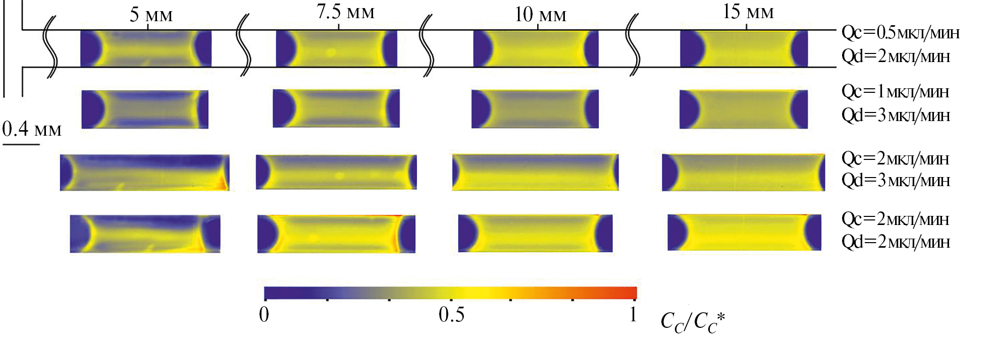 Рис. 8. Поля концентрации в перемычках несущей фазы на различных расстояниях от входа в Т-образный микроканал при вариации расходов несущей и дисперсной фаз.