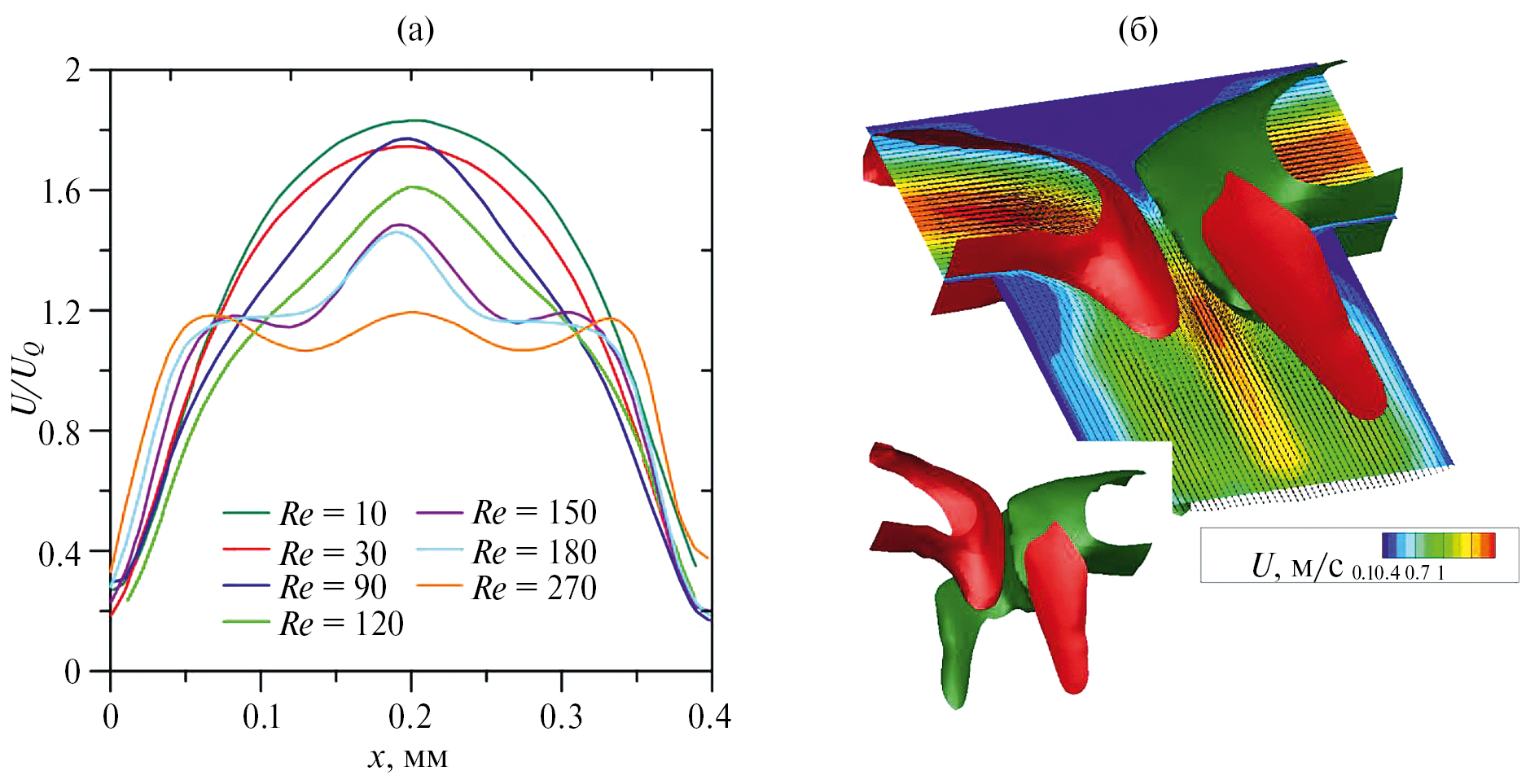 На рис. 10а представлены нормированные на среднерасходную скорость профили скорости в центральном сечении микроканала на расстоянии 3.5 калибра от его торца. При малых числах Рейнольдса наблюдается безвихревое ламинарное течение жидкостей, профиль скорости в центральном сечении канала близок к профилю Пуазейля. Увеличение числа Рейнольдса до 90 приводит к увеличению числа Дина, что способствует формированию вторичных течений в канале – возникает пара вихрей, однако плоскость симметрии в канале не нарушается. Об этом свидетельствует изменение профиля скорости, происходит его “поджатие” за счет возникновения нормальной к плоскости измерения скорости. При Re ≥ 150 на профиле скорости появляются перегибы (вторая производная равна нулю), связанные с возникновением S-образной структуры в течении – течение из вихревого переходит в “захватывающий” режим, при этом теряя симметричность относительно центральной оси микроканала. На рис. 10б показано среднее поле скорости в центральном сечении микроканала и изоповерхности средней поперечной скорости, полученные по полям скорости в пяти сечениях микроканала, равноудаленных симметрично вверх и вниз от центральной плоскости канала. Изоповерхности постоянной поперечной скорости обозначены красным (V = 0,4 Q/S) и зеленым цветом (V = –0,4 Q/S). Несимметричность изоповерхностей поперечной скорости также свидетельствует о возникновении S-образной структуры.