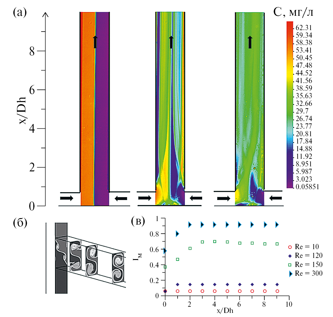 На рис. 11в представлены графики зависимости эффективности перемешивания в Т-канале от расстояния от входа в смешивающий канал при числах Рейнольдса 10, 120, 150 и 300. При малых числах Рейнольдса течение ламинарное безвихревое, и поперечный оси канала перенос примеси происходит только за счет диффузии. При увеличении числа Рейнольдса возникают вихри Дина с сохранением симметрии течения, которые приводят лишь к небольшому увеличению эффективности перемешивания (см. зависимости для Re = 10 и Re = 120). При достижении Re = 150 происходит переход в “захватывающий” режим, структура течения теряет симметрию, эффективность перемешивания в канале резко возрастает, что связано с возникновением S-образной слоистой структуры в микроканале, визуализация которой представлена на рис. 11б по данным численного моделирования [26]. При Re = 300 эффективность перемешивания на 9 калибрах канала достигает 0.9. Стоит отметить, что использование метода micro-LIF дает завышенные значения эффективности перемешивания при Re > 150, так как он позволяет проводить регистрацию только осредненных по глубине канала полей концентраций.