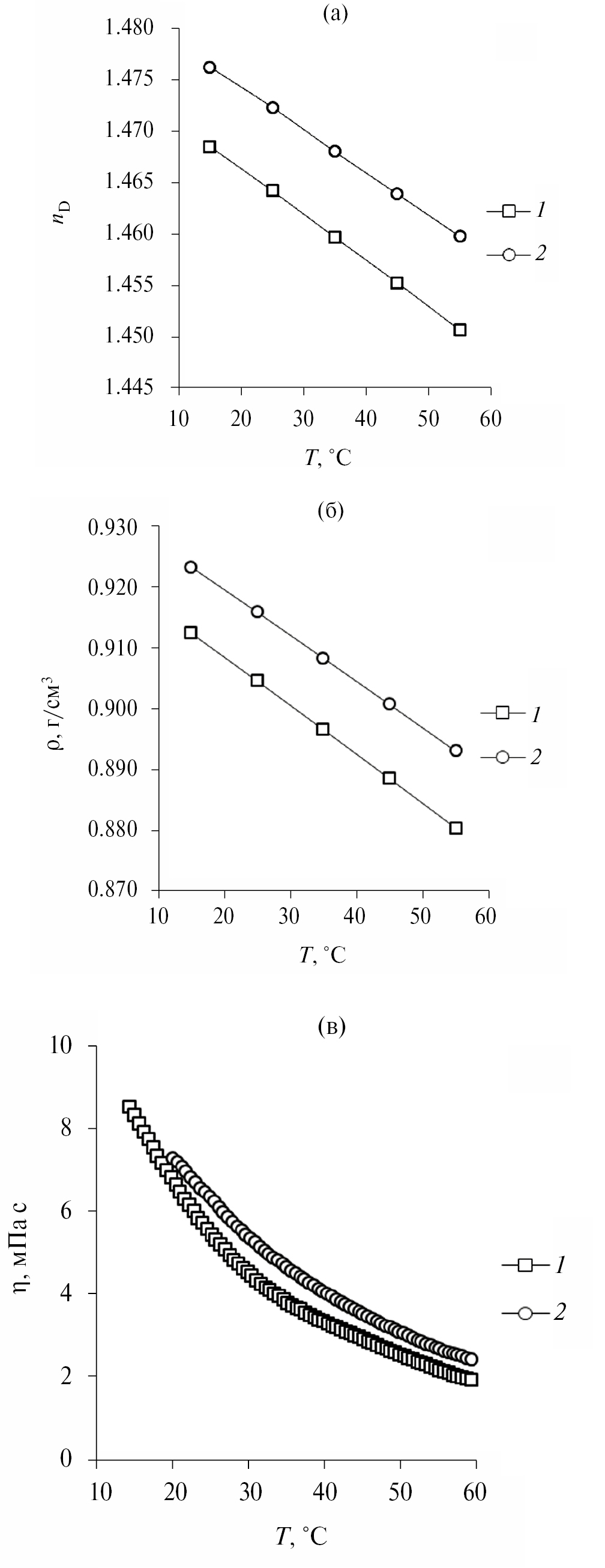 Рис. 4. Зависимость показателя преломления (а), плотности (б) и вязкости (в) от температуры для HES: линалоол/камфора 1/1 (1) и гераниол/камфора 1/1 (2).