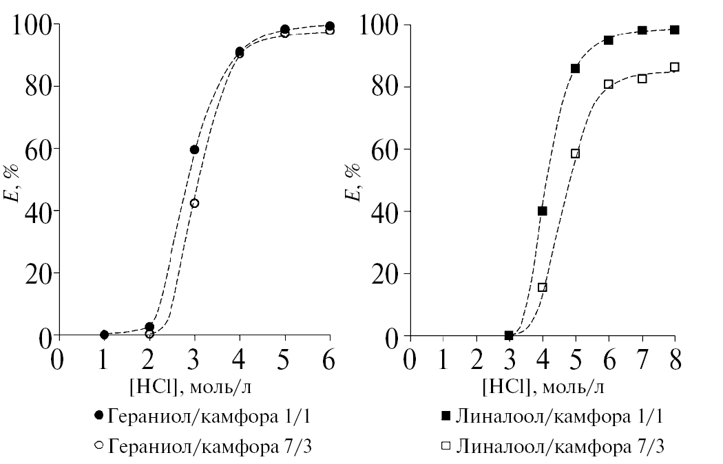 Согласно приведенному механизму, введение HCl будет способствовать экстракции ионов Fe(III). Для изучения влияния кислотности среды была построена зависимость степени извлечения Fe(III) от содержания HCl в диапазоне концентраций от 0 до 8 моль/л при соотношении спирт/камфора 1/1 и 7/3. Полученные результаты (рис. 6) показывают, что при увеличении концентрации HCl происходит увеличение эффективности экстракции Fe(III). Такое поведение можно объяснить тем, что при увеличении концентрации HCl происходит преимущественное образование комплексов [FeCl4]– и иона оксония (ROH⸱⸱⸱H)+, что способствует протеканию реакции по уравнению (4). Также видно, что гераниол/камфора является более эффективным экстрагентом, чем линалоол/камфора при одинаковой концентрации HCl. Это можно объяснить тем, что линалоол является третичным спиртом, а гераниол – первичным, что накладывает стерические трудности на процесс экстракции железа. Кроме того, такое различие в эффективности экстракции также, вероятно, связано с тем, что линалоол более эффективно экстрагирует HCl за счет более основной OH-группы по сравнению с гераниолом.