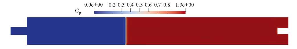 Посредством полученного распределения скорости был проведен расчет эволюции концентраций веществ. Начальные распределения сырья и продукта реакции во всей области расчета принимались равными значениям 0.95 и 0.05. На левой границе безразмерная концентрации сырья задавалась значением 1. Модельные коэффициенты диффузии задавались равными Ds = Dp = 0.1.