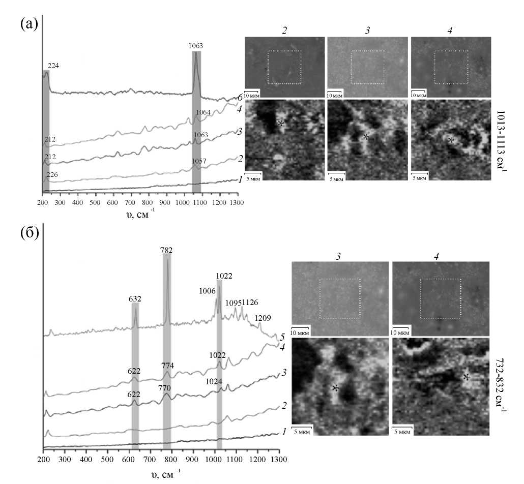 Спектры комбинационного рассеяния исследуемых образцов и их оптические изображения получены с помощью конфокального рамановского спектрометра Alpha 500 (WITec, Германия) и программного обеспечения WITec Control/Project Plus 2.1. 2500 спектров комбинационного рассеяния были сняты с площади 25×25 мкм (50×50 спектров) в диапазоне от 200 до 1300 см–1. Время интегрирования для получения каждого спектра комбинационного рассеяния составляло 1 с. Карты распределения СДГ и BTA по поверхности образцов были построены при анализе спектров в диапазоне волновых чисел, соответствующем характеристическому для устанавливаемого вещества пику.