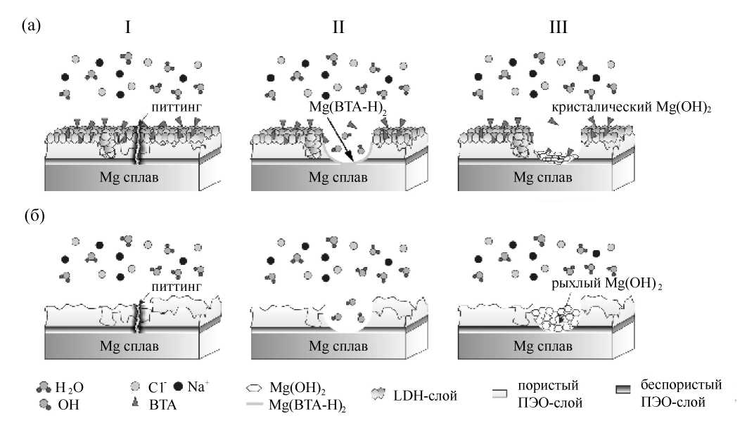 Аналогичный процесс происходит в области дефекта в базовом ПЭО-покрытии без СДГ и ингибитора (рис. 8, Iб). В дефекте ПЭО-покрытия инициируется процесс деградации магниевого сплава (рис. 8, IIб), в результате чего формируется некристаллический и неплотный слой гидроксида магния (рис. 8, IIIб). В образце же ПЭО-СДГ(BTA) (рис. 8, IIIа) за счет формирования комплекса Mg(BTA-Н)2 образуется более компактный и кристаллический Mg(OH)2. Следовательно, образование продуктов коррозии происходит с меньшей скоростью, что приводит к более эффективному заживлению дефектного участка поверхности [4, 27–29]. Образование комплекса Mg(BTA-Н)2 (4) также будет препятствовать снижению коррозионной активности образца с ингибиторсодержащим покрытием. В отсутствии комплекса, снижающего скорость коррозии, скорость образования гидроксида магния выше. Более высокая скорость образования продуктов коррозии приводит к формированию крупных кристаллов, представляющих более рыхлый защитный слой.