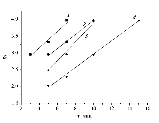 Рис. 3. Кинетика внутренней диффузии в координатах уравнения Бойда десорбции катионов тяжелых металлов на фосфате титана: 1 – Cu2+, 2 – Ni2+, 3 – Co2+, 4 – Mn2+.