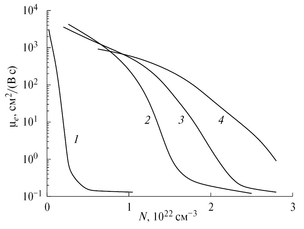 Рис. 1. Подвижность электронов в гелии в зависимости от плотности газа на линии насыщения [4] (1) и при температурах [5]: 2 – 4.2 К, 3 – 7.3, 4 – 11.6.