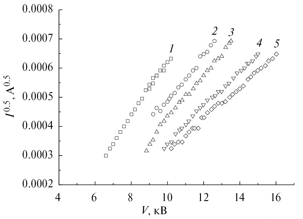 Рис. 2. Зависимость тока от напряжения как I1/2(V) коронного разряда в жидком гелии при 4.2 K, радиусе острия катода 2.5 мкм и давлениях: 1 – 1 МПа, 2 – 2, 3 – 4, 4 – 8, 5 – 10.