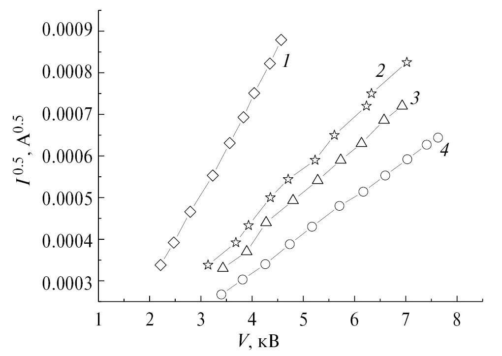 Рис. 3. Линейная зависимость I1/2(V), полученная в экспериментах для короны в закритическом гелии при давлении p = 0.4 МПа и различных температурах: 1 – 10 К, 2 – 7, 3 – 6, 4 – 4.2.