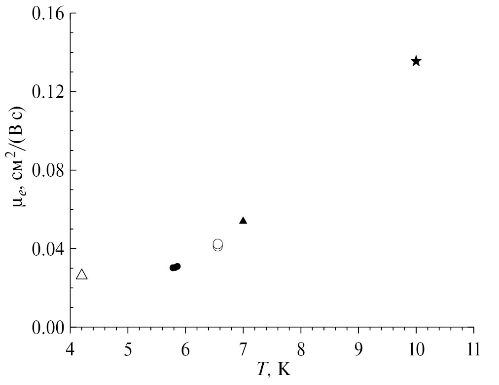 Подвижность электронов в сверхкритическом гелии при температурах от 4.2 К (жидкий He) до 10 К (сверхкритический газ гелий) и давлении 0.4 МПа, полученная в результате измерений тока короны и рассчитанная по (3), показана на рис. 4. Подвижность электронов увеличивается при этом в пять раз, и это нельзя объяснить уменьшением плотности гелия.