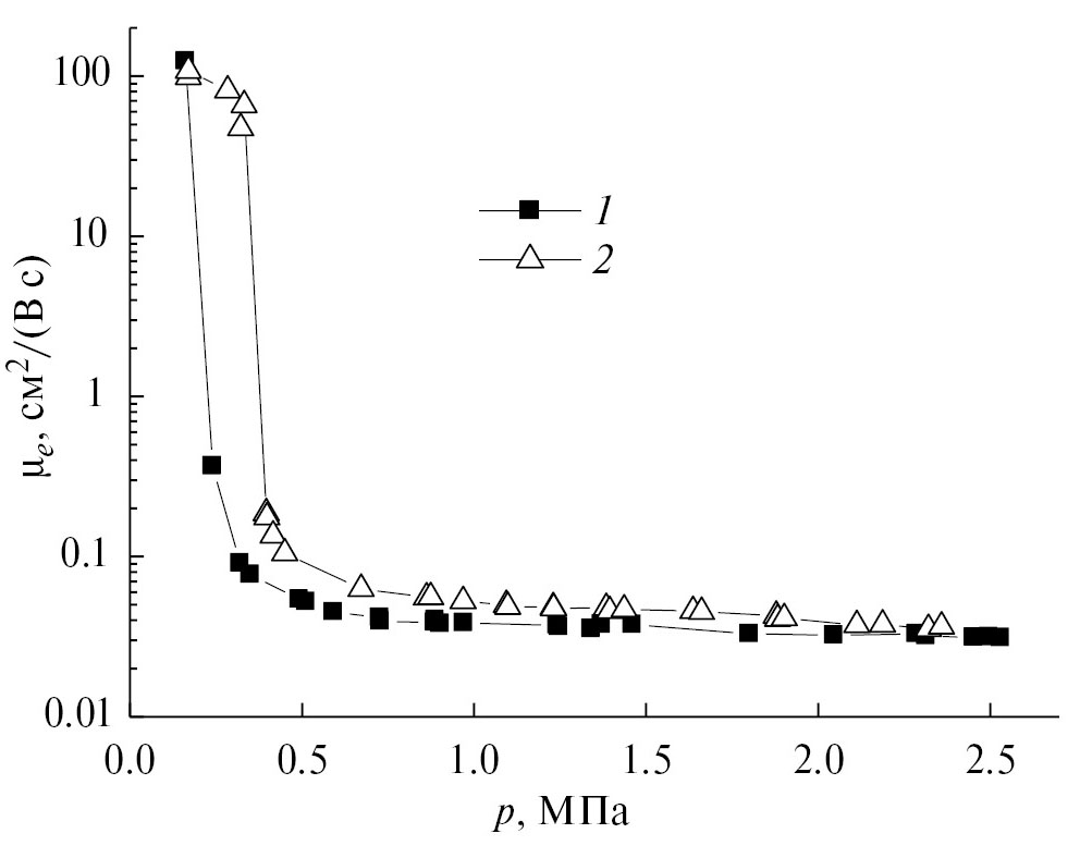 Рис. 5. Подвижность электронов в гелии в зависимости от давления при сверхкритических температурах: 1 – 7 К, 2 – 10.