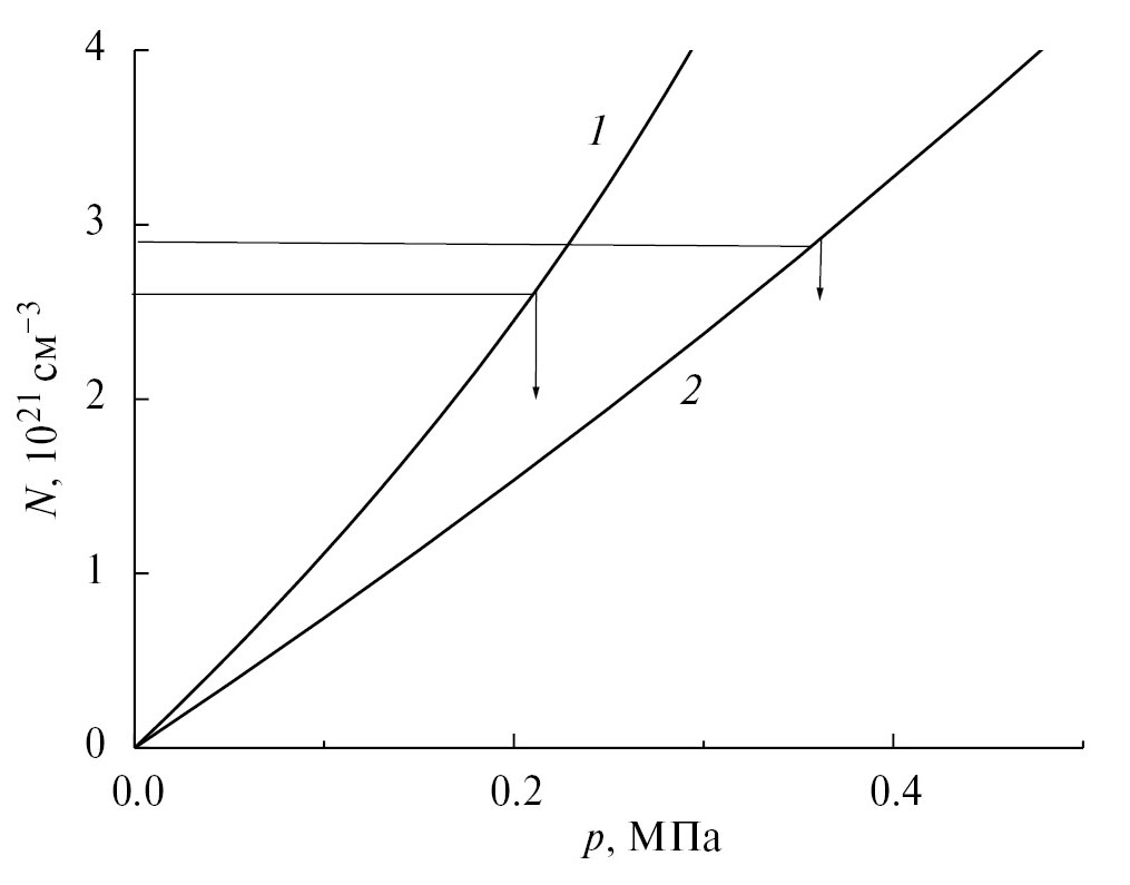 Рис. 6. Закритические изотермы гелия 7 (1) и 10 K (2) [14], переход между режимами разряда с высокой и низкой подвижностью электронов происходит при 0.2 и 0.36 МПа соответственно.