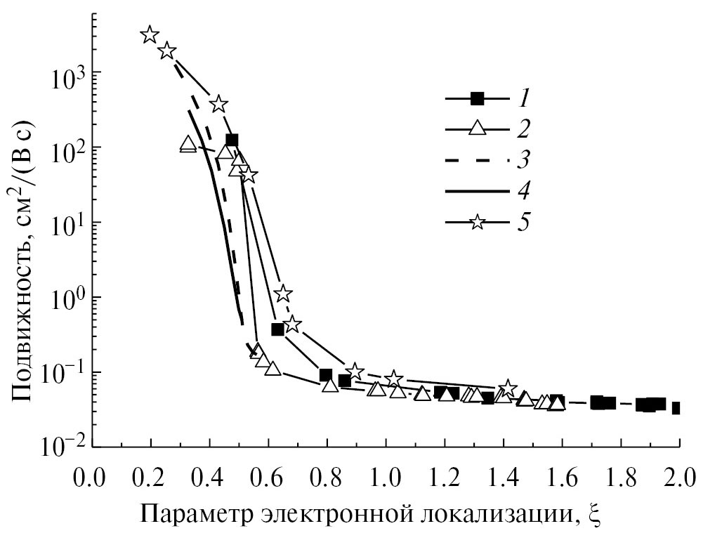 Рис. 7. Закон подобия для перехода от состояния с высокой подвижностью электронов к состоянию с низкой подвижностью по модели [20]: 1 – 7 К; 2 – 10, данная работа; 3 – 7.3 К; 4 – 11.6 [3]; 5 – насыщенный пар [2].