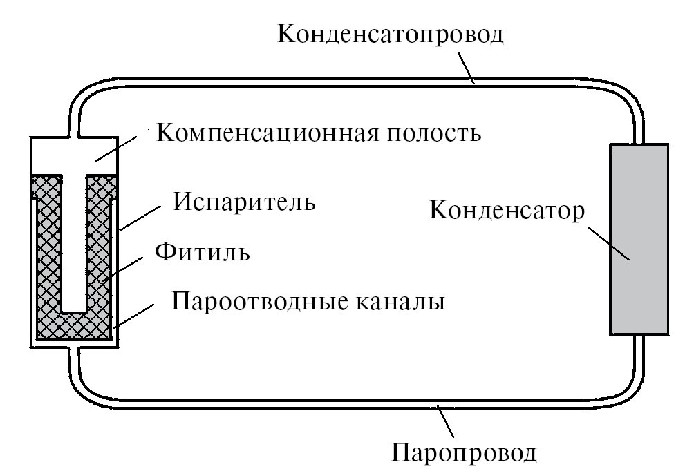 Дополнительные преимущества, которые позволяет реализовать данная схема, включают возможность достаточно легко конфигурировать паровую и жидкостную линии или делать их гибкими. Испаритель и конденсатор могут иметь различную форму и размеры, адаптированные к условиям практического применения этих устройств. Возможно также создание разветвленных устройств, включающих несколько испарителей и конденсаторов. Кроме того, при более благоприятном горизонтальном положении КТТ продемонстрировали способность передавать тепло на расстояние, измеряемое десятками метров. Такие устройства могут использоваться, например, в системах утилизации низкопотенциального тепла и солнечной энергии [5, 6], в системах обогрева помещений [7], в системах охлаждения мощной электроники [8, 9]. В [10] представлены результаты разработки и испытаний КТТ для эффективной утилизации энергии с длиной паровой линии 10 м и конденсатором длиной 3 м, которые имели диаметр 10 мм. В качестве теплоносителя использовался этанол. При горизонтальном расположении максимальная мощность устройства составила 160 Вт. Еще одна КТТ с такой же паровой линией и конденсатором длиной 8 м при горизонтальном расположении продемонстрировала максимальную мощность 340 Вт [11]. При работе в “антигравитационном” режиме, когда испаритель был расположен на 1 м выше конденсатора, максимальная мощность достигала 220 Вт. Весьма успешным является применение длинных КТТ в энергоэффективных системах терморегулирования космических аппаратов, где экономия энергии и массы имеет критическое значение [12–15]. В частности, была представлена информация о КТТ длиной 14 м с паровой линией диаметром 3 мм и пропиленом в качестве теплоносителя, которая была разработана для космической программы “Марс-96” [12]. Пропиленовые и аммиачные КТТ с длиной паровой линии 3 м и диаметром 3 мм также разрабатывались для системы терморегулирования космических аппаратов “Ямал-200” [13], один из которых успешно работает на орбите около 20 лет. Максимальная мощность 500 Вт была продемонстрирована здесь при наземных испытаниях КТТ с аммиаком в качестве теплоносителя. Среди аналогичных устройств с большой дистанцией передачи тепла следует отметить также КТТ с длиной паропровода 16 м и диаметром 4 мм, которая продемонстрировала максимальную мощность 100 Вт с аммиаком в качестве теплоносителя при благоприятной ориентации, когда испаритель был расположен ниже конденсатора на 0.68 м [16].