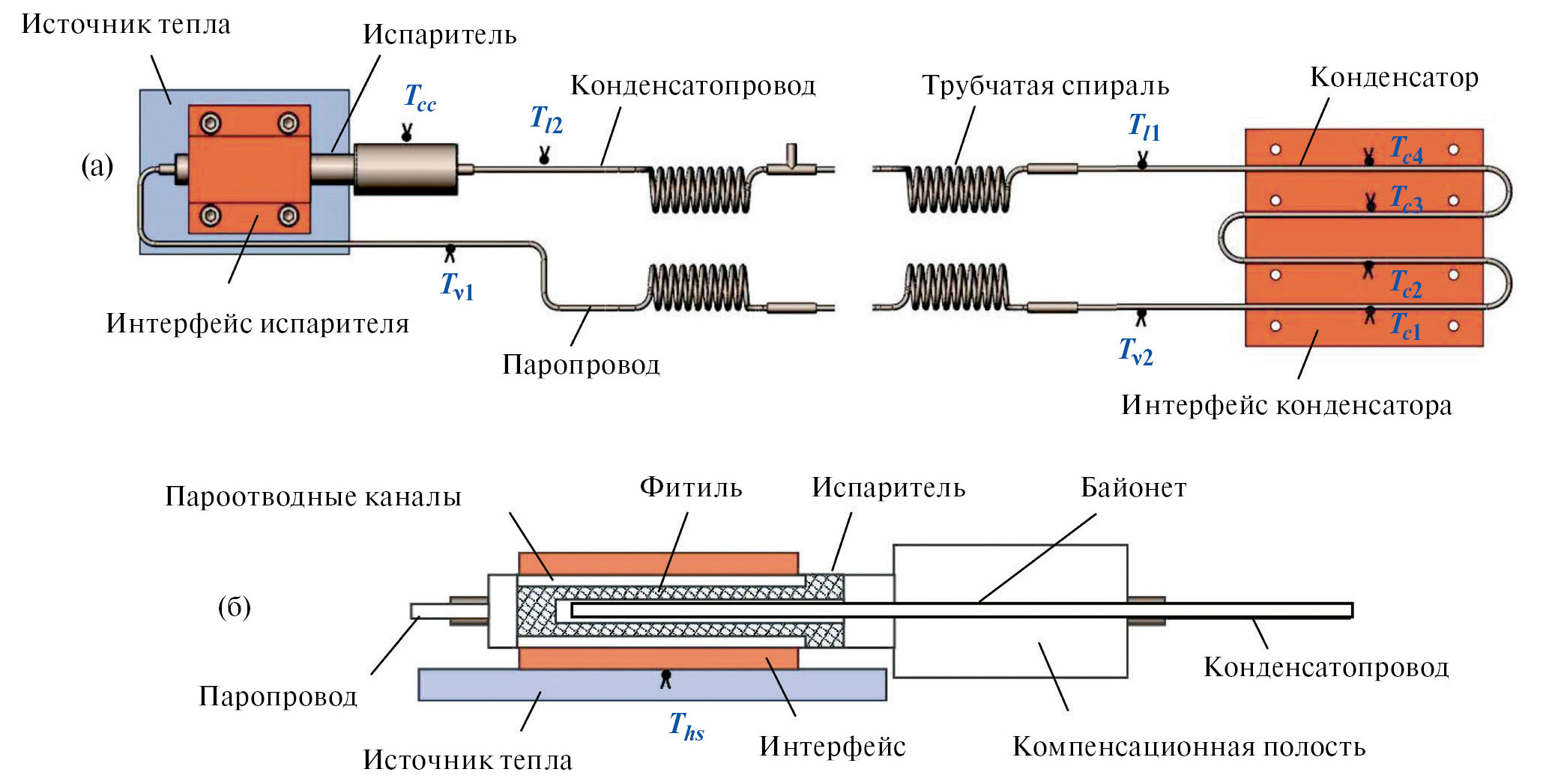 Рис. 2. Схема КТТ (а) и испарителя с расположением термопар (б).