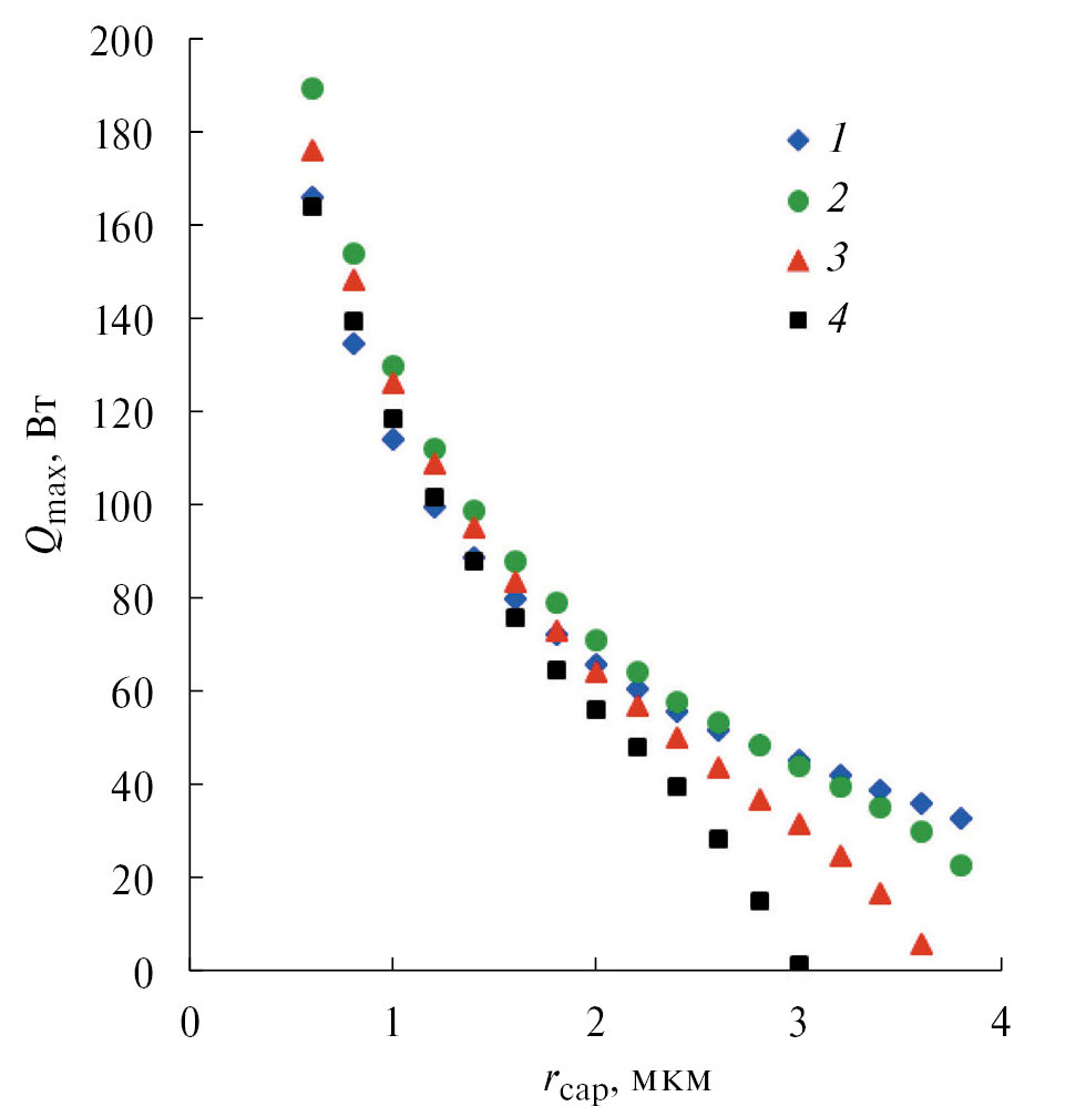 Рис. 4. Зависимости максимальной тепловой нагрузки от радиуса пор при различных температурах пара: 1 – Tv = 0°C, 2 – 20, 3 – 40, 4 – 50.