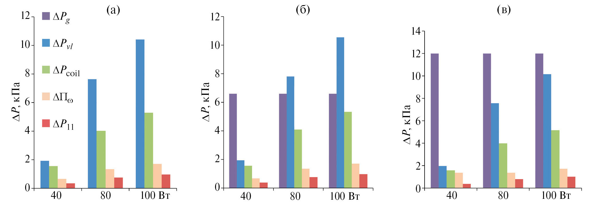 Рис. 5. Потери давления в КТТ при H = 0 м (а), 1.1 (б), 2 (в).
