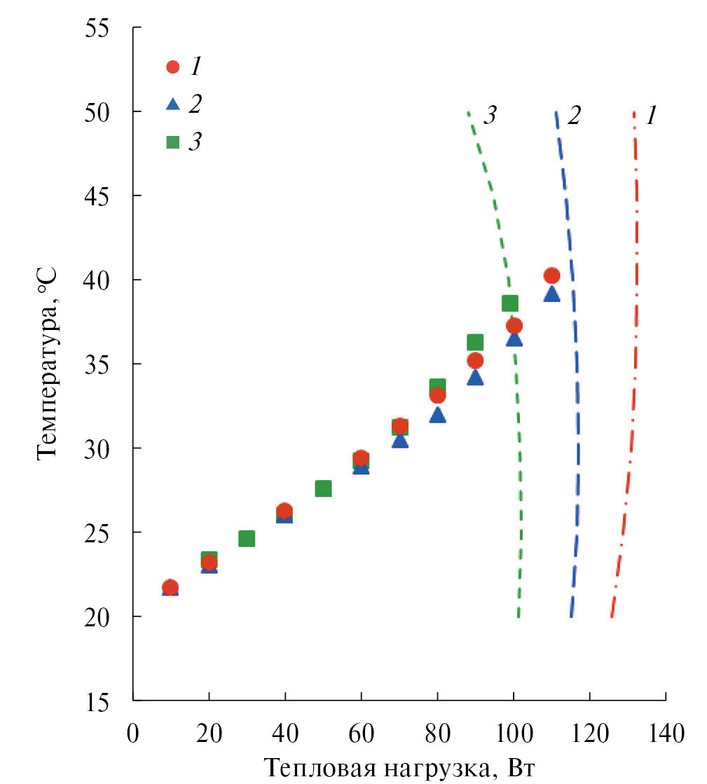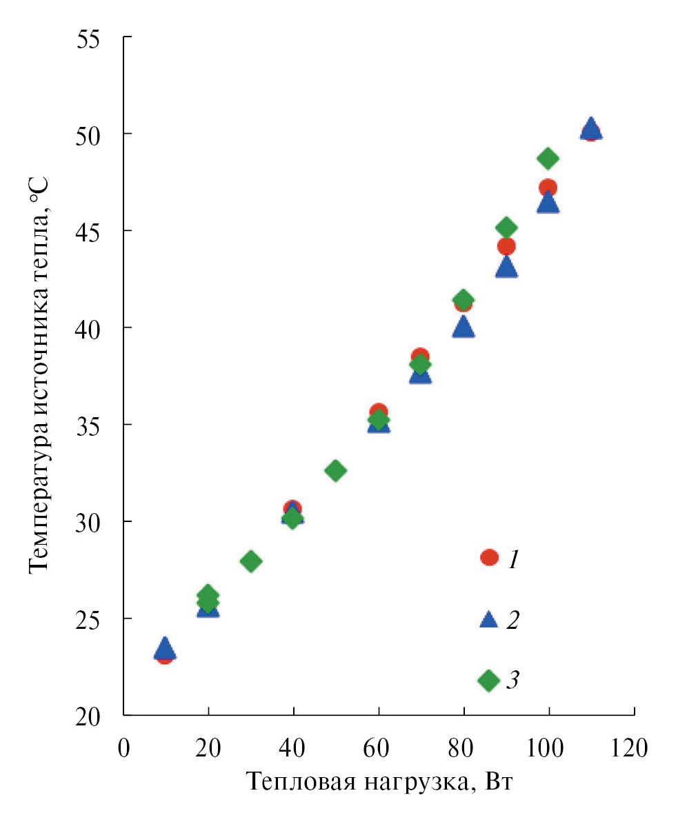 На рис. 6, в частности, показана зависимость температуры источника тепла, который в данном случае моделирует реальный охлаждаемый объект, от величины тепловой нагрузки при различных положениях КТТ. Температура источника тепла слабо зависит от изменения ориентации устройства в гравитационном поле, что, как отмечалось выше, является одним из основных преимуществ контурных тепловых труб. При номинальной тепловой нагрузке 100 Вт температура источника тепла изменяется в пределах 46.5–48.7°С.