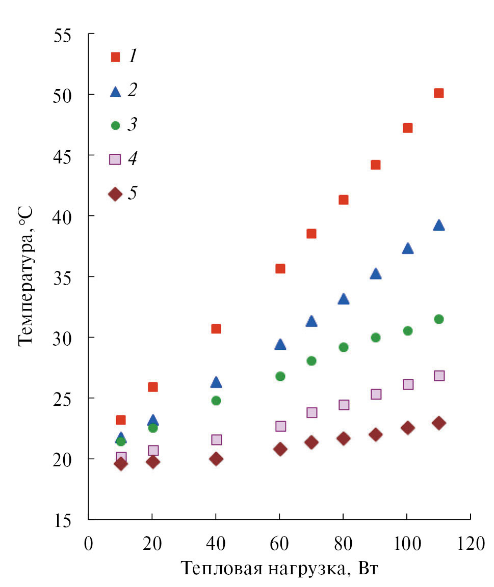 Рис. 7. Распределения температуры в КТТ в зависимости от тепловой нагрузки при Tcool = 20°C и H = = 0 м: 1 – Ths, 2 – Tv1, 3 – Tc, 4 – Tcc, 5 – Tl2.