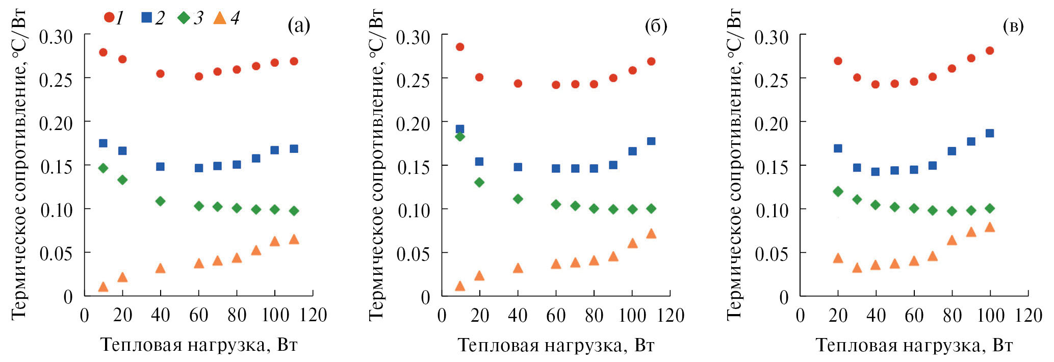 Рис. 9. Зависимости термического сопротивления от тепловой нагрузки при H = 0 м (а), 1.1 (б), 2 (в): 1 – Rsys, 2 – RLHP, 3 – Rj, 4 – Rc.