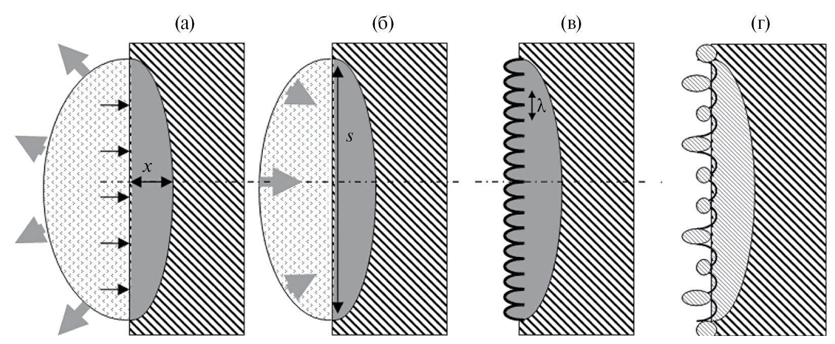 Рис. 1. Схема капиллярного механизма взаимодействия лазерного импульса с металлической подложкой и выбор масштаба резонатора s (длины ванны расплава): (а) – образование газовой каверны и расплава металла глубиной x~aτ под действием лазерного импульса, (б) – формирование стоячих деформационных волн под действием схлопывающейся газовой каверны, (в) – усиление деформационными волнами стоячих капиллярных волн на поверхности расплава, (г) – застывание капиллярных волн и формирование поверхностного рельефа.
