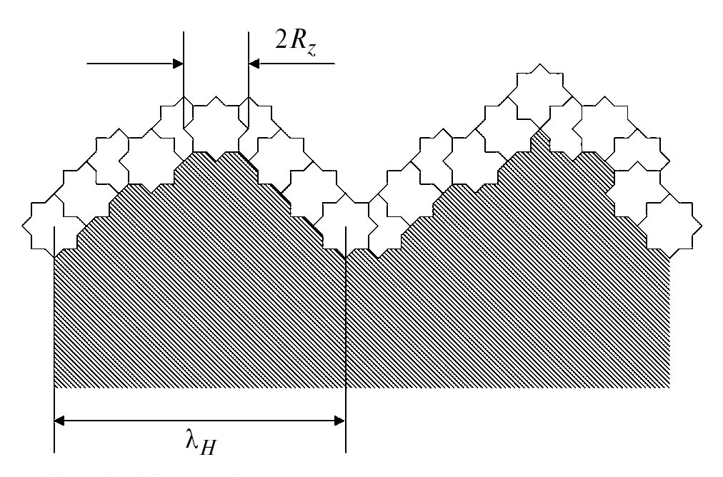Рис. 2. Схема формирования капиллярного нанорельефа с характерным пространственным периодом λH при образовании твердой корки из кристаллов радиусом Rz над расплавом.