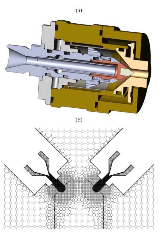 Рис. 1. Геометрия и расчетная сетка: (а) – разрез плазмотрона ПН-ПА1 (уплотнения не показаны), (б) – расчетная сетка (разрез в центральном сечении).
