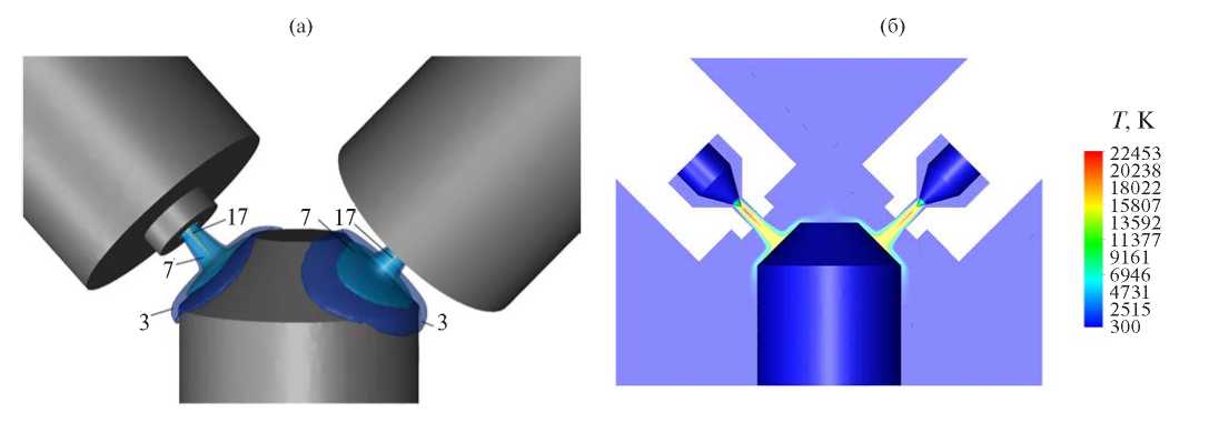 Из распределения давления (рис. 4а) видно, что внутри плазмотронов абсолютное давление достигает 1.23 атм и падает до 1 атм на выходе из сопла. Распределение z-составляющей плотности тока показывает (рис. 4б), что дуга замыкается через металлический электрод.