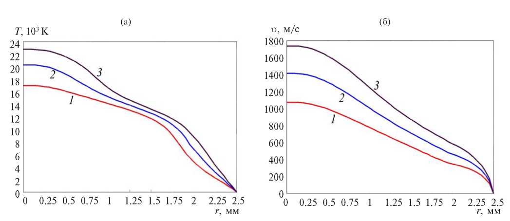 Рис. 5. Усредненные радиальные зависимости температуры (а) и скорости (б) плазмы в выходном сечении плазмотрона при расходе аргона G = 0.8 г/с и различных значениях тока дуги: 1 – 150 А, 2 – 200, 3 – 250.