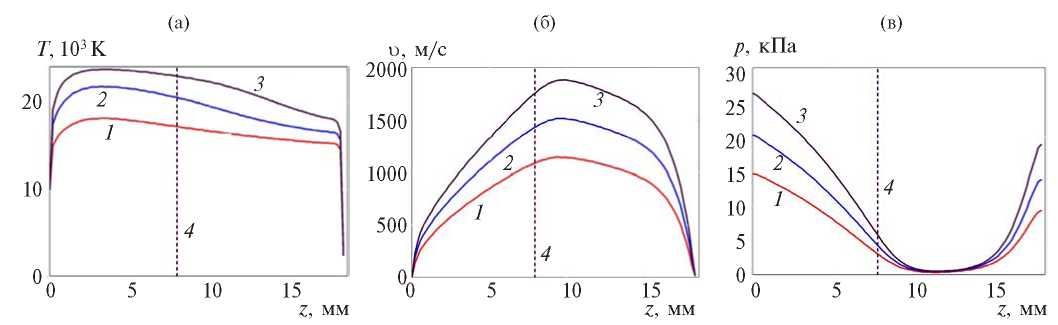 Рис. 6. Распределения температуры (а), скорости (б) и избыточного давления (в) плазмы вдоль оси плазмотрона при расходе аргона G = 0.8 г/с и токах дуги: 1 – 150 А, 2 – 200, 3 – 250, 4 – граница плазмотрона.
