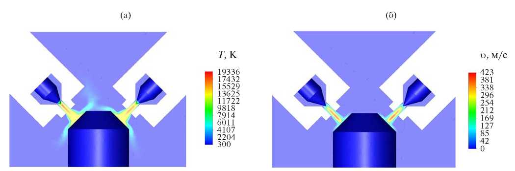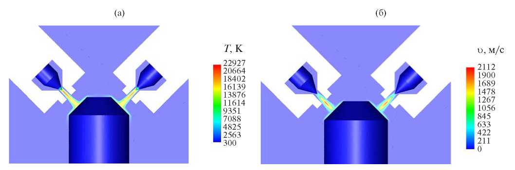 Рис. 8. Двумерные распределения температуры (а) и скорости (б) плазмы в центральном сечении при большом расходе плазмообразующего газа (I = 200 А, G = 1.5 г/с).