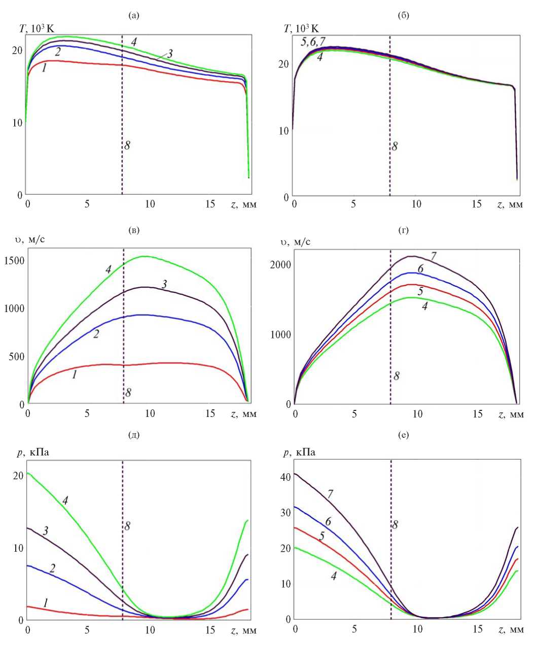 Рис. 10. Распределения температуры (а), (б), скорости (в), (г) и избыточного давления (д), (е) плазмы вдоль оси плазмотрона при токе дуги I = 200 А и различных значениях расхода аргона: 1 – 0.1 г/с, 2 – 0.3, 3 – 0.5, 4 – 0.8, 5 – 1.0, 6 – 1.2, 7 – 1.5, 8 – граница плазмотрона.