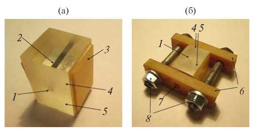 Рис. 1. Стеклянный блок с образцом гафния (а): 1 – кончик фольги гафния; 2 – образец гафния, видимый сквозь верхнее стекло; 3 – боковые наклеенные тонкие пластины стеклотекстолита; 4 – верхнее стекло (толщина – 11 мм); 5 – нижнее стекло (толщина – 11 мм); (б) – струбцина, сжимающая стекла ТФ-5: 6 – пластины стеклотекстолита, 7 – отверстие для вывода излучения, 8 – болтовая стяжка.