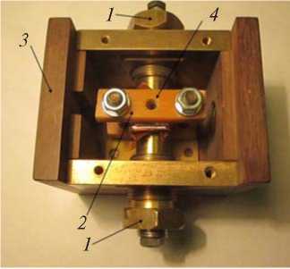Рис. 2. Сборка (без верхней крышки с отверстием для вывода излучения): 1 – подводящие электроды (с возможностью поступательного перемещения для поджатия контактов), 2 – струбцина с образцом, 3 – блок импульсного нагрева со снятой верхней крышкой, 4 – отверстие для вывода излучения для измерения температуры.