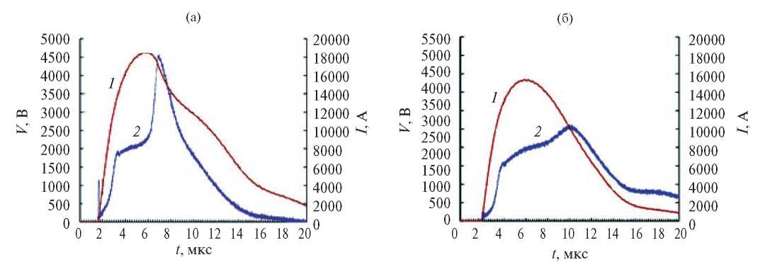 Рис. 3. Зависимости тока (1) и напряжения (2) от времени: (а) – для быстрого нагрева гафния в воде, (б) – быстрого нагрева гафния под давлением (в стекле).